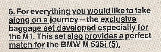 Recently purchased by Ronald Aker, this is an original and in very good condition, optional motorsport luggage set, as offered for the BMW M1 and BMW E12 M535i