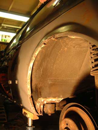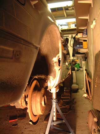 Nose and inner wings have been re sprayed, this allowed the radiator and oil cooler etc to be refitted and the engine restarted, despite standing for over 3 years once the petrol was through she fired up straight away. So it was turned around and driven into the garage so work could commence on the rear end. Neil stripped the paint from both rear arches and it showed them to contain large amounts of filler hiding some very rusty looking metal.