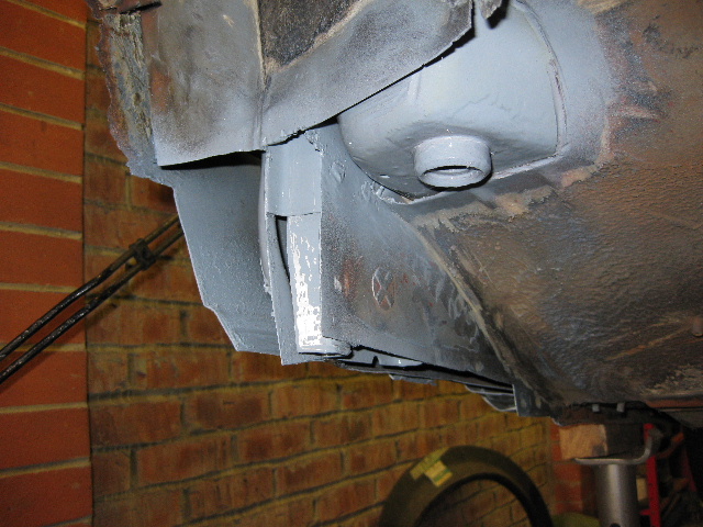 | This is the rear drivers side end of the sill and rear axle mounting point, despite this area looking like it just needed a good wire brush, it turned out to be quite crumbly once we started on it, in this shot I have cut away the rot around the axle mounting bush location and sprayed with weld through primer, I have also started on the first section to the rear of the sill |