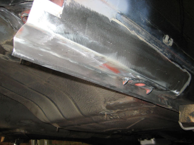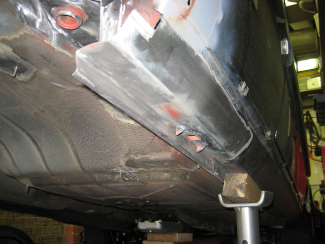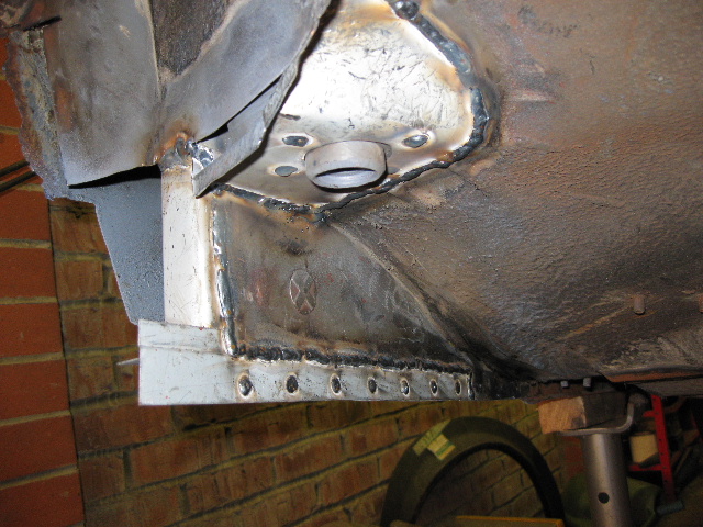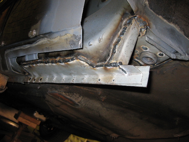 The finished outer sill section with the jacking point removed from the old sill section and welded in place, I have left the sill section purposely long for the time being as this area will need more work when the wheel arches are done, and better to leave it long now, than cut it short and regret it later. |