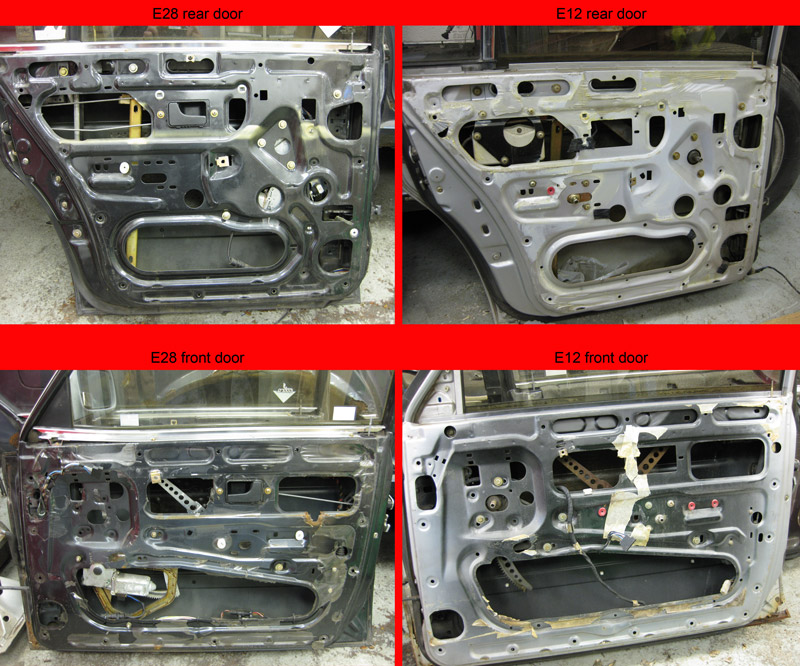These need a little more work, as the door pull is mounted slightly differently, but all the E12 holes are present in the E28's, the trim cards are a completely different design, but will swap over quite easily with their corresponding clips
