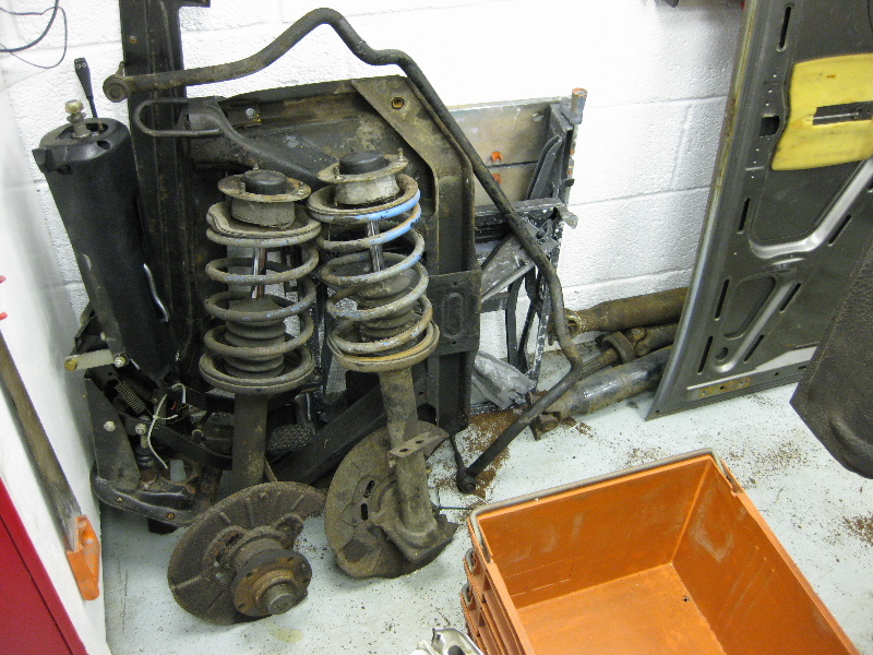 the front panel was in excellent shape, it must have been replaced after the accident, so to save it and also to aid removing the engine and box, I cut it off. it had not been a genuine M535 front panel, as the oil cooler brackets has been home made and welded to the front, the oil cooler was infact cable tied on in places as one of the brackets to hold it on had been broken off.