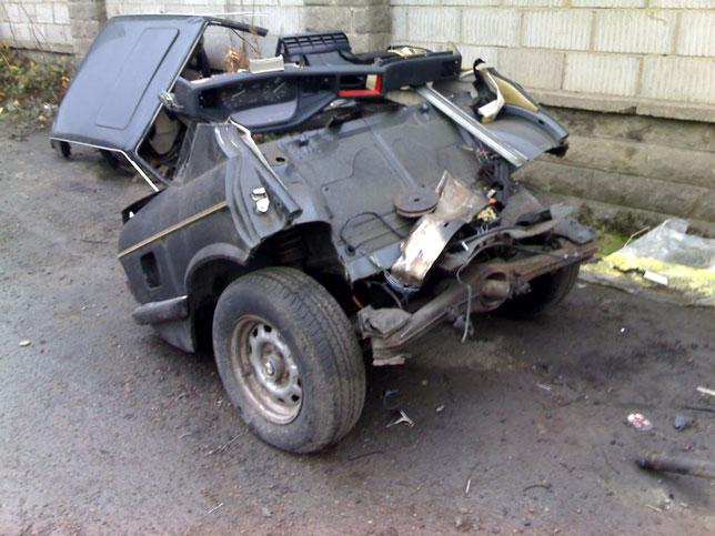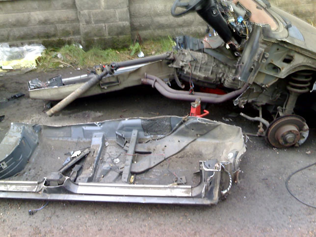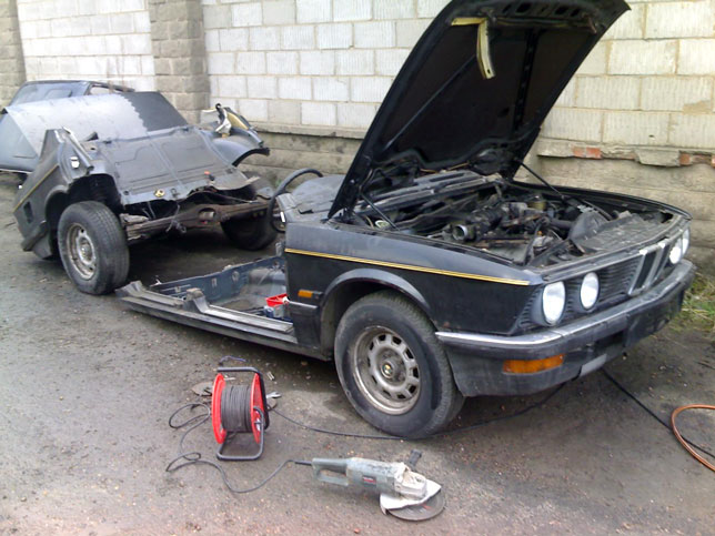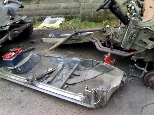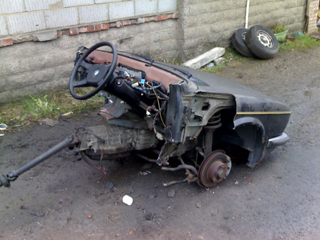 This is an E28 528i that I have just broken, the main focus of my attention was the windscreens and floor pans, by the time I took this photo I had already removed the doors, interior and screens. I also took the exhaust as it was nearly new, interestingly enough when I laid it side by side with my E12 M exhaust it followed the same route and all the brackets were in the same place. It was also interesting to note that the E28 528 exhaust was a bigger bore than the E12 M535 one. |