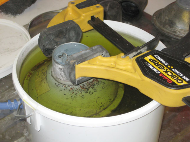 I set up this arrangement to dip them in the Deox C solution, as I found out while doing a test sample that the Deox C eats aluminium, which is what the top section of the headlight is made from |