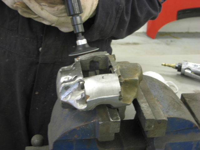 I then removed the pistons and seals as I wanted to try to clean the metal surface finish up as I wanted to try some home Electro plating, even if this did not work, then the smoother finish would be better for painting. I first started with a small air operated grinder with an 80 grit Roloc disc fitted, this started the smoothing process. |