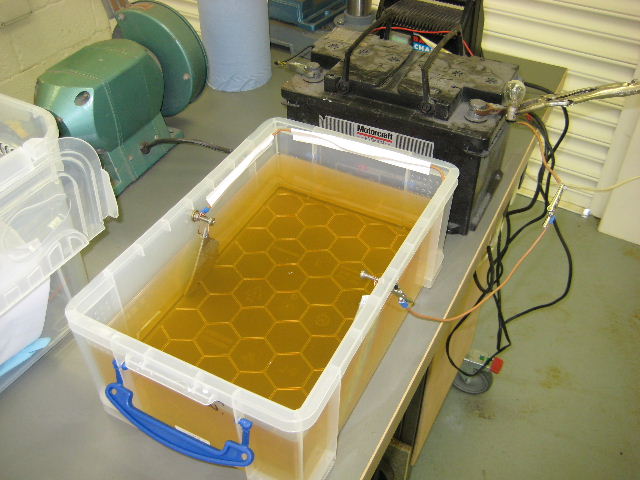This is the zinc plating setup, the power supply you use is a normal car battery, then some bulbs are wired in series to drop the voltage to the required range, you check this with a voltmeter, it is a bit makeshift, but I guess one of the reasons why it was cheaper, if the results are successful then I can always purchase a proper power supply later. |