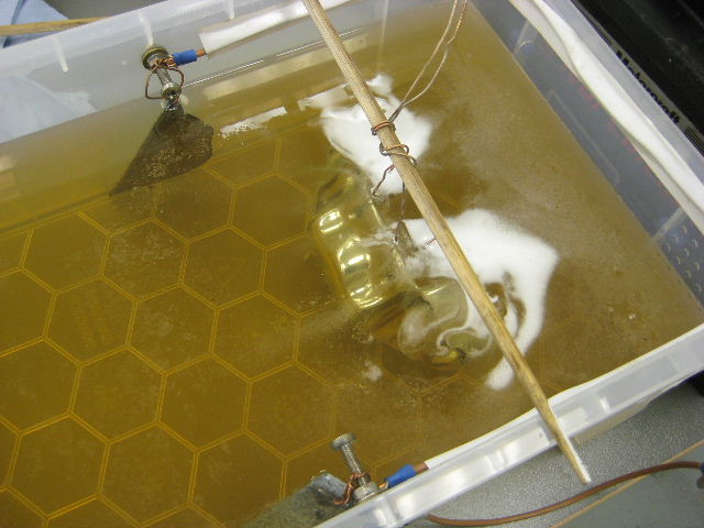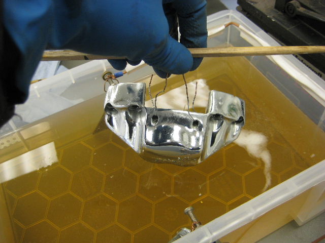 Then after a quick rinse, it is into the plating solution, with the part connected by wire to the -ve terminal on the battery and the zinc anodes with the bulb in line, connected to the +ve terminal, it has to stay in here for 30 - 50 minutes. |